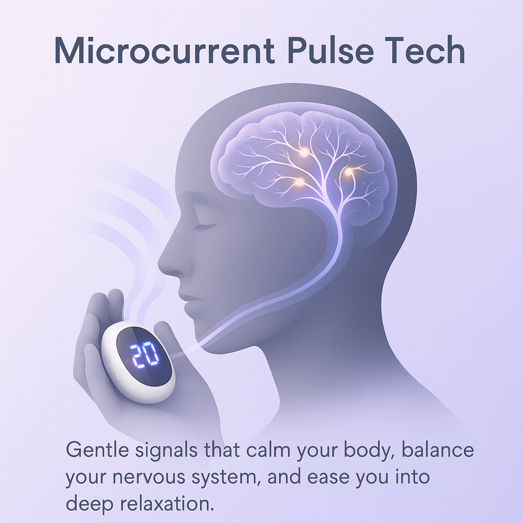 DriftPod uses gentle microcurrent pulses delivered through your palm to help calm overactive neural pathways. The technology is inspired by Cranial Electrotherapy Stimulation (CES) principles used in clinical settings, but simplified for everyday use. You'll feel a subtle, rhythmic pulse that helps interrupt anxious thought patterns and guides your nervous system toward a calmer state.